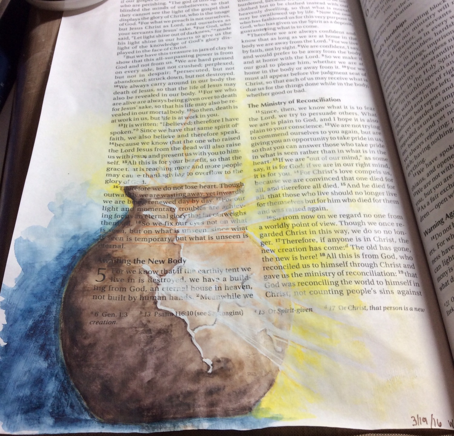 We are hard pressed on every side, but not crushed; perplexed, but not in despair; persecuted, but not abandoned; struck down, but not destroyed. We always carry around in our body the death of Jesus, so that the life of Jesus may also be revealed in our body. For we who are alive are always being given over to death for Jesus’ sake, so that his life may also be revealed in our mortal body. So then, death is at work in us, but life is at work in you. It is written: “I believed; therefore I have spoken.” Since we have that same spirit of faith, we also believe and therefore speak, because we know that the one who raised the Lord Jesus from the dead will also raise us with Jesus and present us with you to himself. All this is for your benefit, so that the grace that is reaching more and more people may cause thanksgiving to overflow to the glory of God. Therefore we do not lose heart. Though outwardly we are wasting away, yet inwardly we are being renewed day by day. For our light and momentary troubles are achieving for us an eternal glory that far outweighs them all. So we fix our eyes not on what is seen, but on what is unseen, since what is seen is temporary, but what is unseen is eternal.