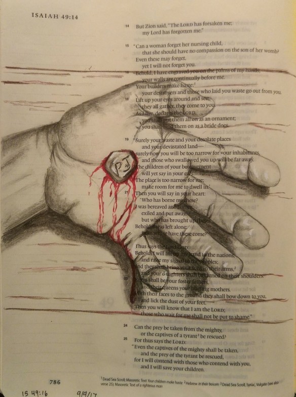 “Can a mother forget the baby at her breast and have no compassion on the child she has borne? Though she may forget, I will not forget you! See, I have engraved you on the palms of My hands; your walls are ever before Me.Isaiah 49:15-16