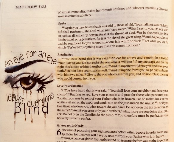 It does not matter who said it -Gandhi, Kahlil Gibran, Martin Luther King or Tevyeh- “An eye for an eye will leave everyone blind” is still a Truth. If Jesus came to give sight to the blind why do WE insist on causing our enemies’ blindness through vengeance, retaliation and self-justification?